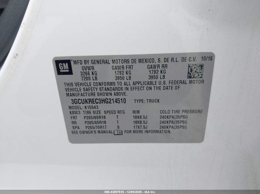 2017 CHEVROLET SILVERADO 1500 2017 року Бензин, 5.3, Полный привод, vin - 3GCUKREC3HG214510 из США
