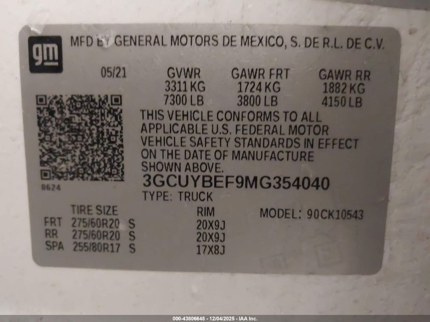 Цвет БелыйЦилиндры 8Привод Полный приводVIN 3GCUYBEF9MG354040Состояние Заводится и едет (проверено)Повреждения Передняя или задняя