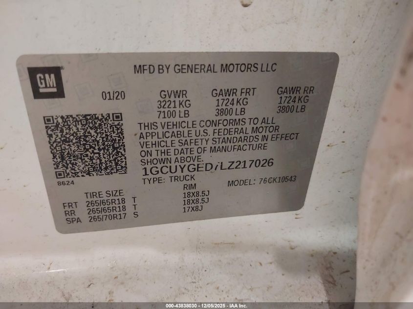 Цвет БелыйЦилиндры 8Привод Полный приводVIN 1GCUYGED7LZ217026Состояние СтационарноПовреждения Передняя или задняя