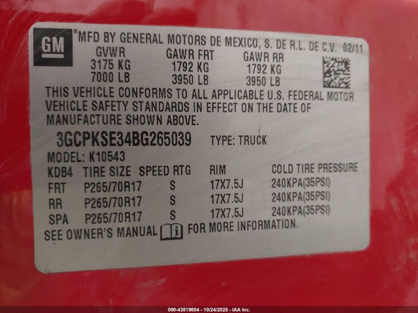 2011 CHEVROLET SILVERADO 1500 2011 року Бензин, 5.3, Полный привод, vin - 3GCPKSE34BG265039 из США