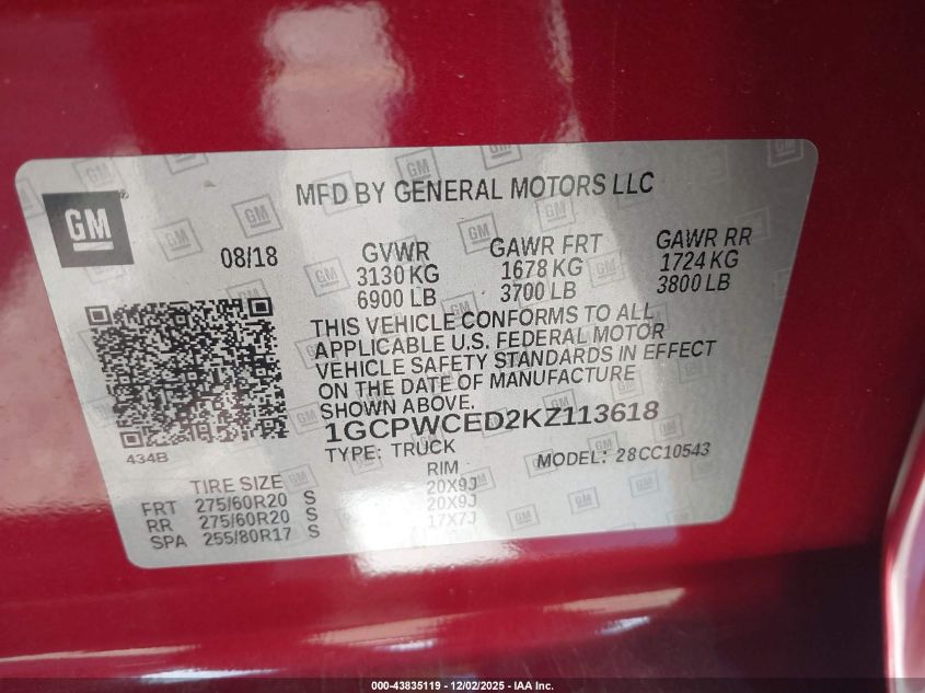 Цвет КрасныйЦилиндры 8VIN 1GCPWCED2KZ113618Состояние ЗаводитсяПовреждения Передняя или задняя