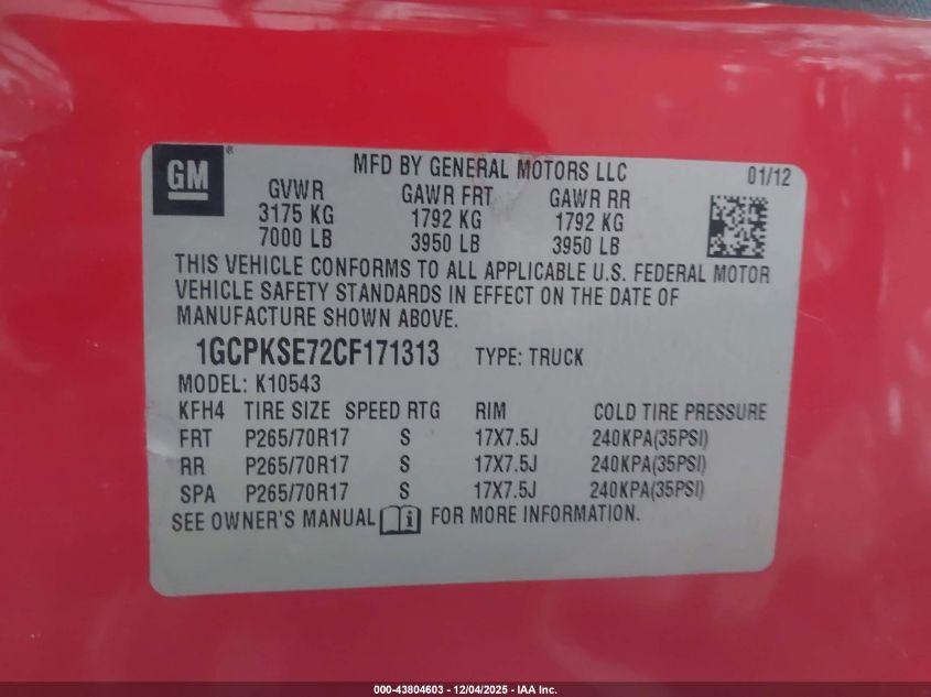 Цвет КрасныйЦилиндры 8Привод Полный приводVIN 1GCPKSE72CF171313Состояние СтационарноПовреждения Передняя или задняя