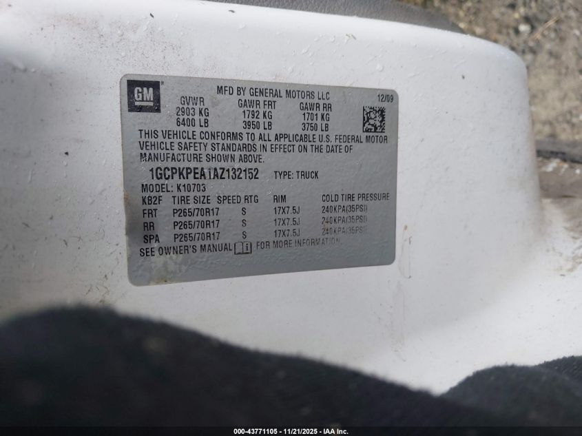 Цвет БелыйЦилиндры 8Привод Полный приводVIN 1GCPKPEA1AZ132152Состояние Заводится и едет (проверено)Повреждения По бокамДата аукциона 2025-12-09