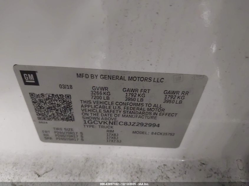 2018 CHEVROLET SILVERADO 1500 2018 року Бензин, 5.3, Полный привод, vin - 1GCVKNEC8JZ292994 из США
