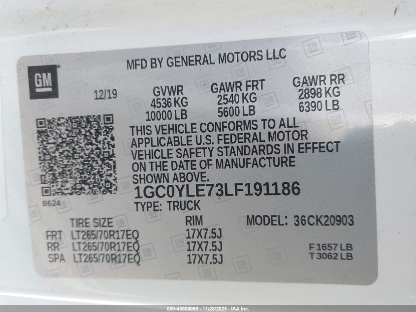 2020 CHEVROLET SILVERADO 2500 2020 року Бензин, 6.6, Полный привод, vin - 1GC0YLE73LF191186 из США