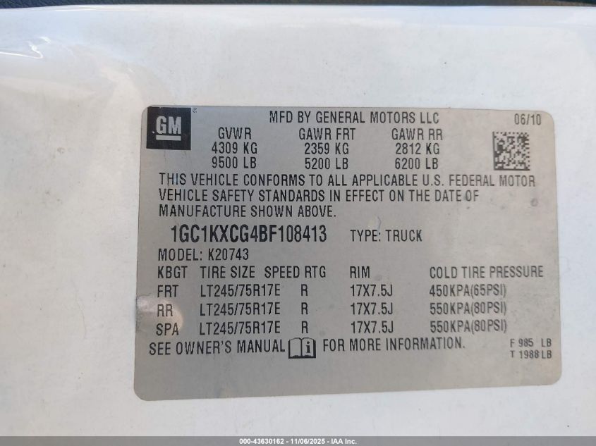 2011 CHEVROLET SILVERADO 2500 2011 року Бензин, 6.0, Полный привод, vin - 1GC1KXCG4BF108413 из США