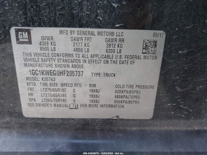 2017 CHEVROLET SILVERADO 2500 2017 року Бензин, 6.0, Полный привод, vin - 1GC1KWEG0HF205737 из США