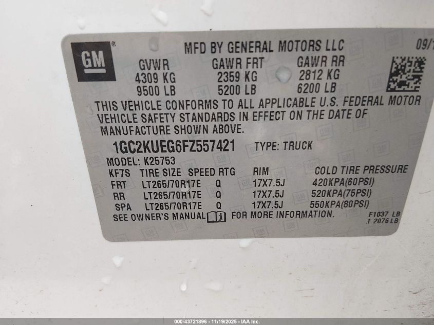 Цвет БелыйЦилиндры 8Привод Полный приводVIN 1GC2KUEG6FZ557421Состояние СтационарноПовреждения Передняя или задняя
