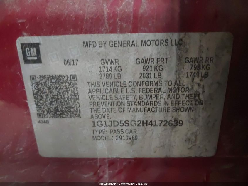 2017 CHEVROLET SONIC 2017 року Бензин, 1.8, Передний привод, vin - 1G1JD5SG2H4172639 из США