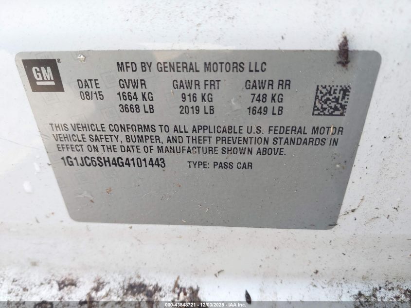 2016 CHEVROLET SONIC 2016 року Бензин, 1.8, Передний привод, vin - 1G1JC6SH4G4101443 из США