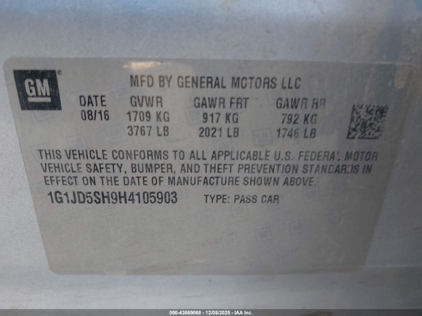 2017 CHEVROLET SONIC 2017 року Бензин, 1.8, Передний привод, vin - 1G1JD5SH9H4105903 из США