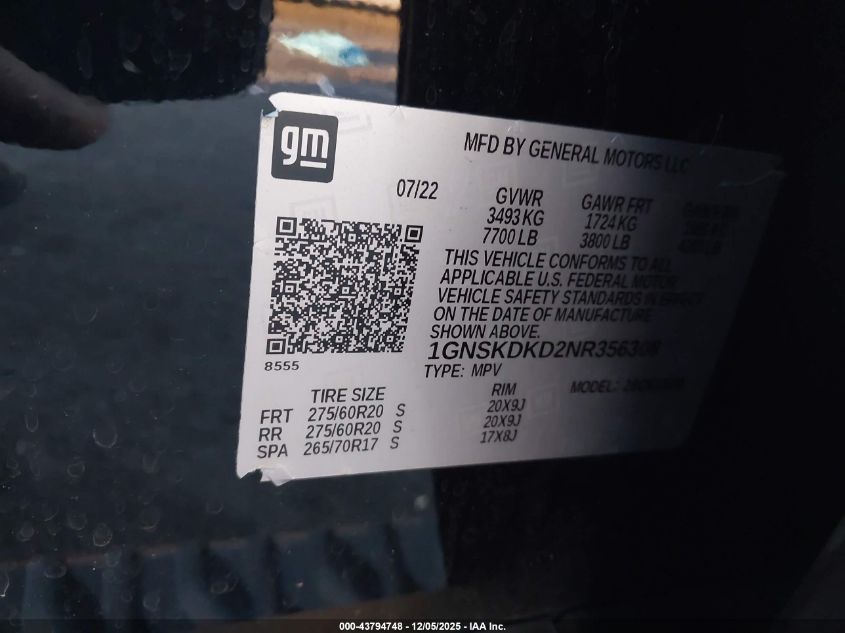 2022 CHEVROLET SUBURBAN 2022 року Бензин, 5.3, Полный привод, vin - 1GNSKDKD2NR356308 из США