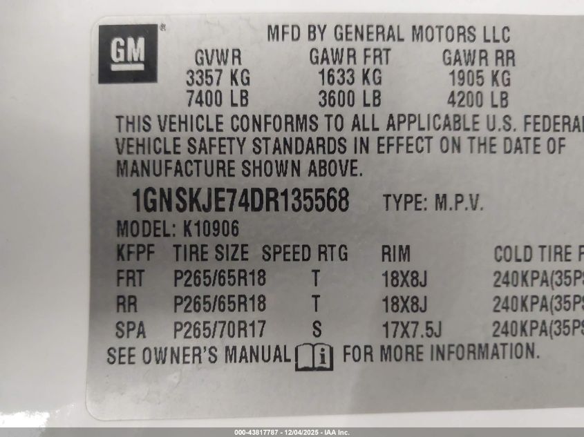 Цвет БелыйЦилиндры 8Привод Полный приводVIN 1GNSKJE74DR135568Состояние Заводится и едет (проверено)Повреждения Передняя левая AutoRIA