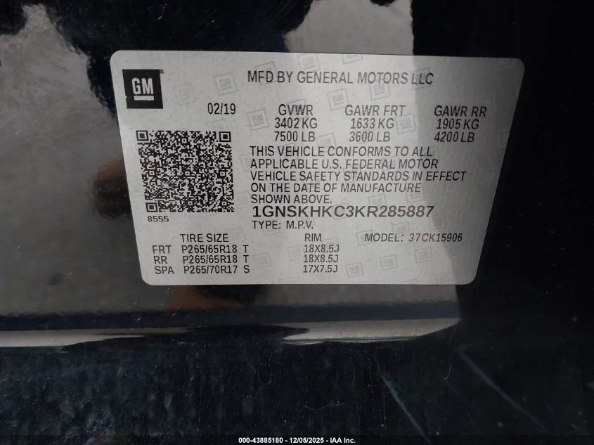 2019 CHEVROLET SUBURBAN 2019 року Бензин, 5.3, Полный привод, vin - 1GNSKHKC3KR285887 из США