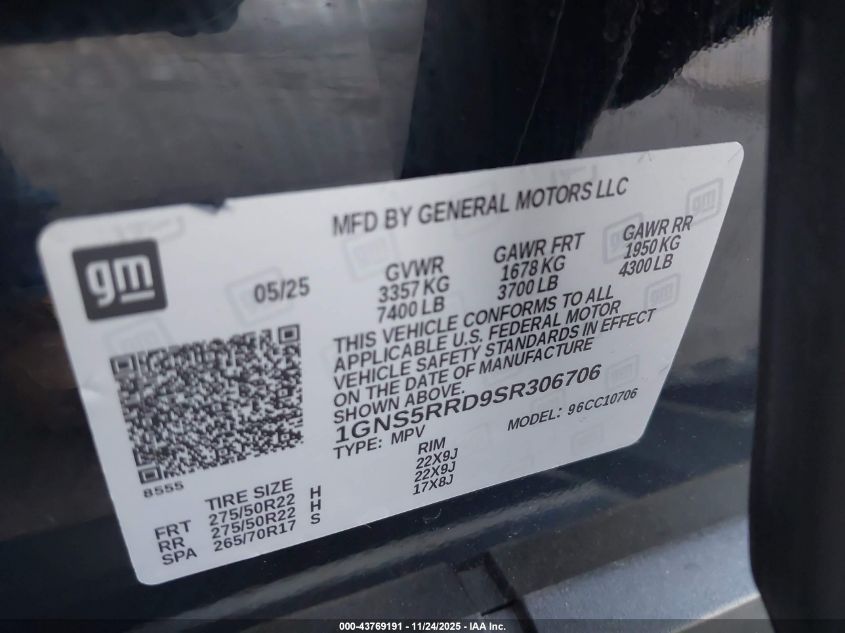 2025 CHEVROLET TAHOE 2025 року Бензин, 5.3, , vin - 1GNS5RRD9SR306706 из США