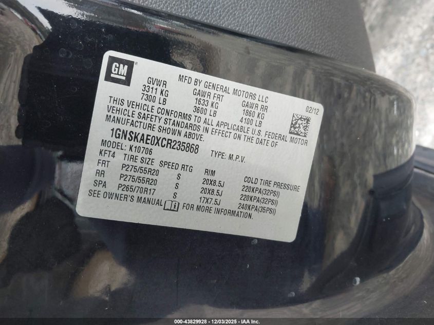 2012 CHEVROLET TAHOE 2012 року Бензин, 5.3, Полный привод, vin - 1GNSKAE0XCR235868 из США