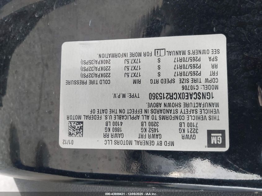 Цвет ЧерныйЦилиндры 8VIN 1GNSCAE0XCR215360Состояние СтационарноПовреждения Обычный износ