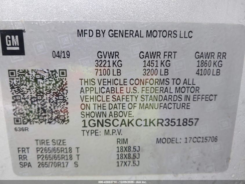 2019 CHEVROLET TAHOE 2019 року Бензин, 5.3, , vin - 1GNSCAKC1KR351857 из США