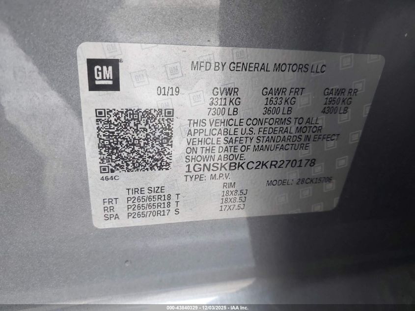 2019 CHEVROLET TAHOE 2019 року Бензин, 5.3, Полный привод, vin - 1GNSKBKC2KR270178 из США