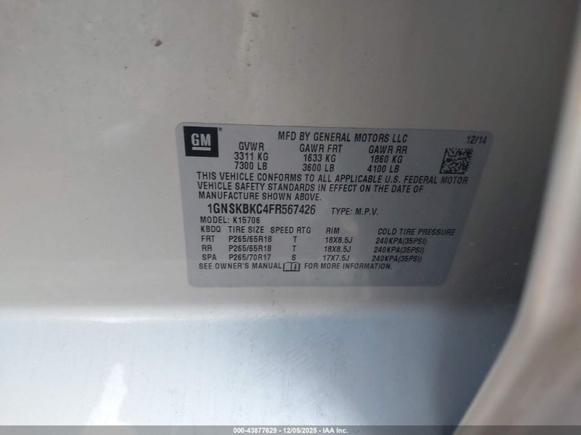 2015 CHEVROLET TAHOE 2015 року Бензин, 5.3, Полный привод, vin - 1GNSKBKC4FR567426 из США