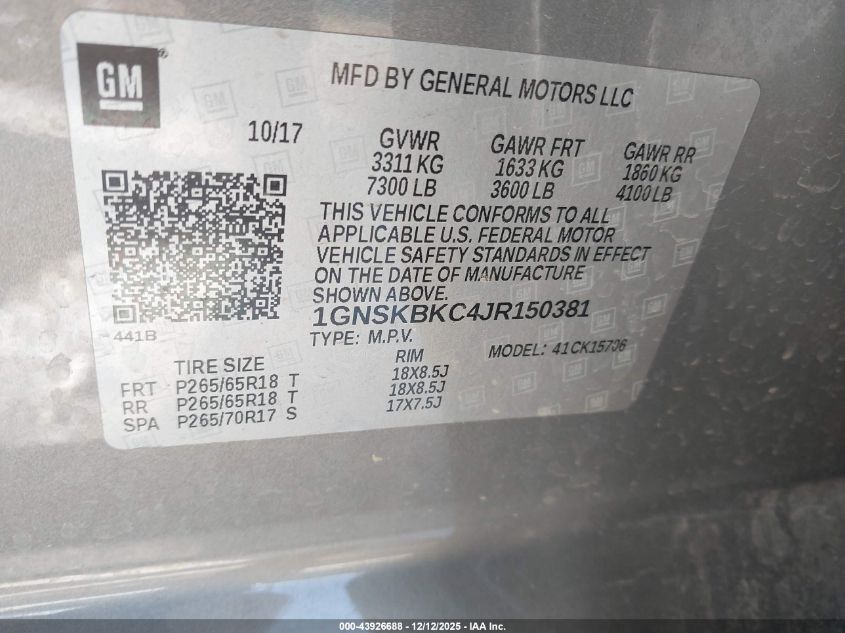 2018 CHEVROLET TAHOE 2018 року Бензин, 5.3, Полный привод, vin - 1GNSKBKC4JR150381 из США