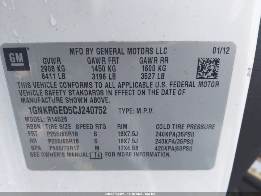 Цвет БелыйЦилиндры 6Привод Передний приводVIN 1GNKRGED5CJ240752Состояние СтационарноПовреждения Передняя левая AutoRIA