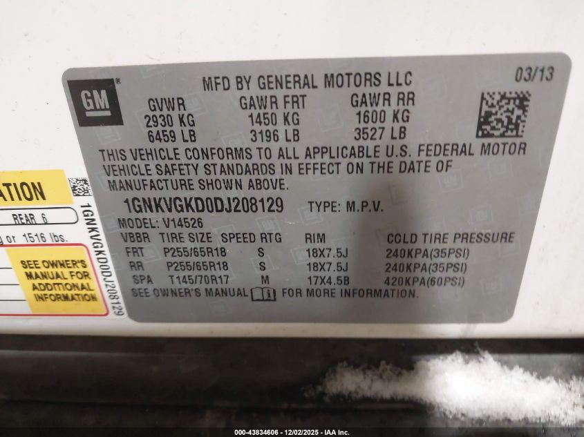 2013 CHEVROLET TRAVERSE 2013 року Бензин, 3.6, Полный привод, vin - 1GNKVGKD0DJ208129 из США