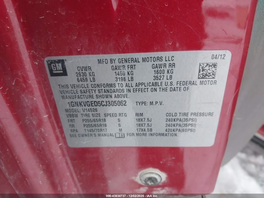 2012 CHEVROLET TRAVERSE 2012 року Бензин, 3.6, Полный привод, vin - 1GNKVGED5CJ305062 из США