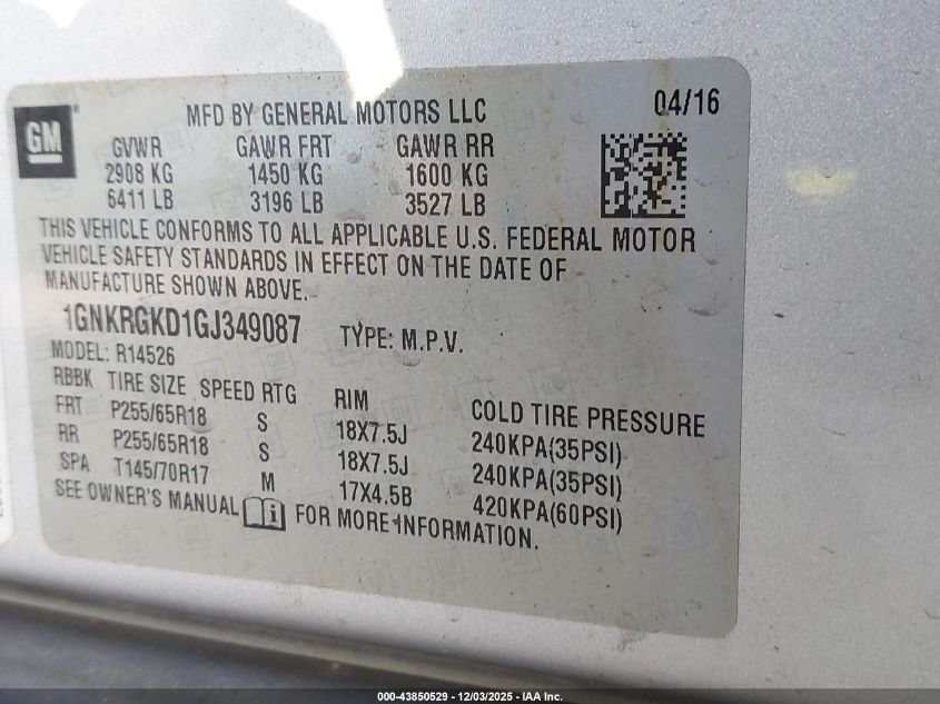 2016 CHEVROLET TRAVERSE 2016 року Бензин, 3.6, Передний привод, vin - 1GNKRGKD1GJ349087 из США
