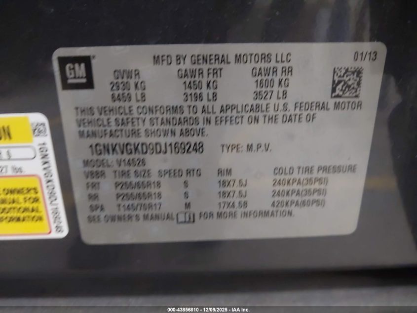 2013 CHEVROLET TRAVERSE 2013 року Бензин, 3.6, Полный привод, vin - 1GNKVGKD9DJ169248 из США