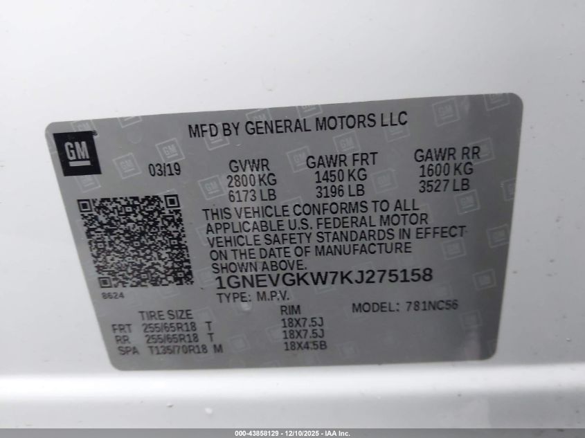 2019 CHEVROLET TRAVERSE 2019 року Бензин, 3.6, Полный привод, vin - 1GNEVGKW7KJ275158 из США