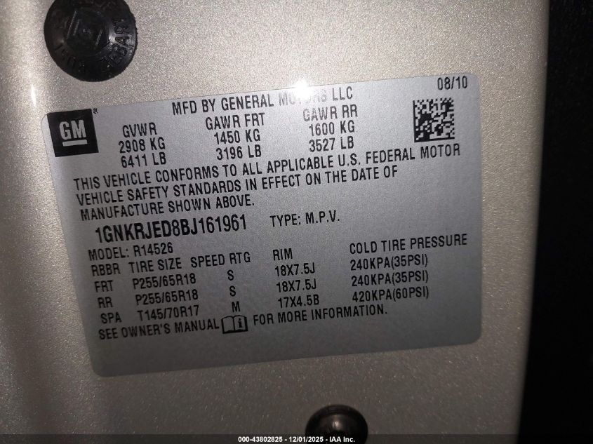 2011 CHEVROLET TRAVERSE 2011 року Бензин, 3.6, Передний привод, vin - 1GNKRJED8BJ161961 из США
