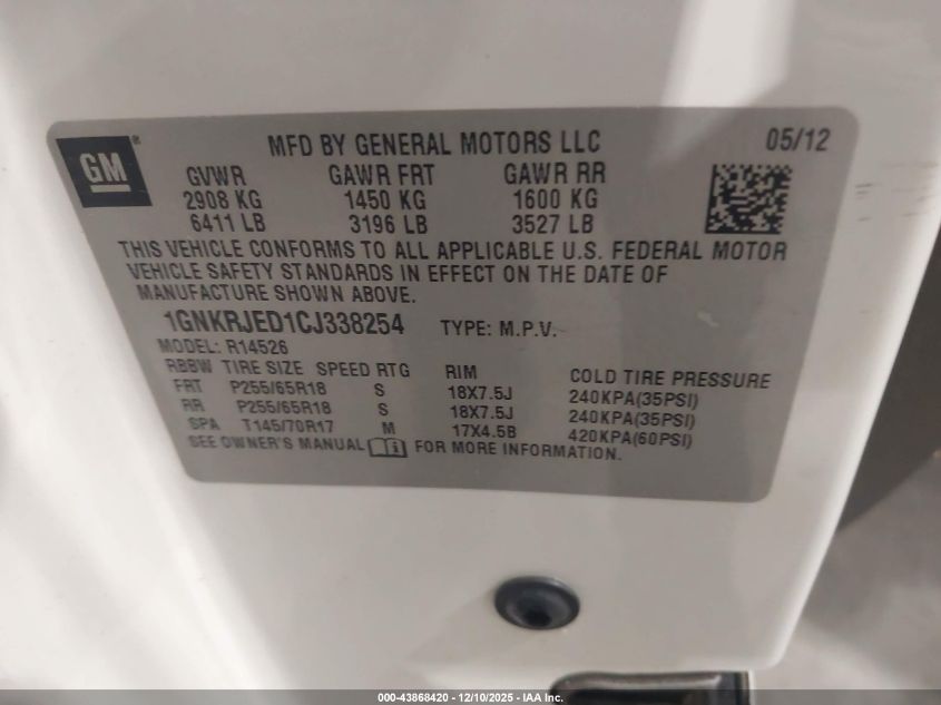 2012 CHEVROLET TRAVERSE 2012 року Бензин, 3.6, Передний привод, vin - 1GNKRJED1CJ338254 из США