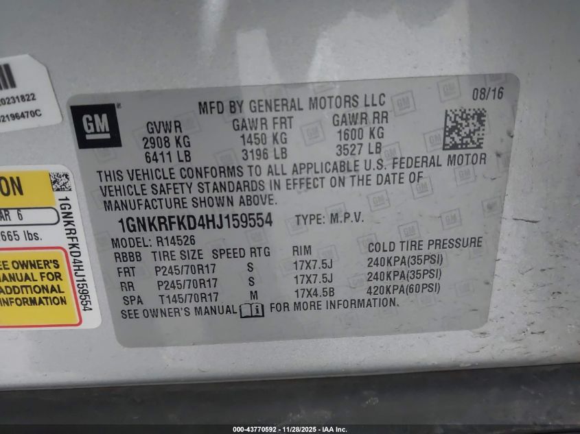 2017 CHEVROLET TRAVERSE 2017 року Бензин, 3.6, Передний привод, vin - 1GNKRFKD4HJ159554 из США