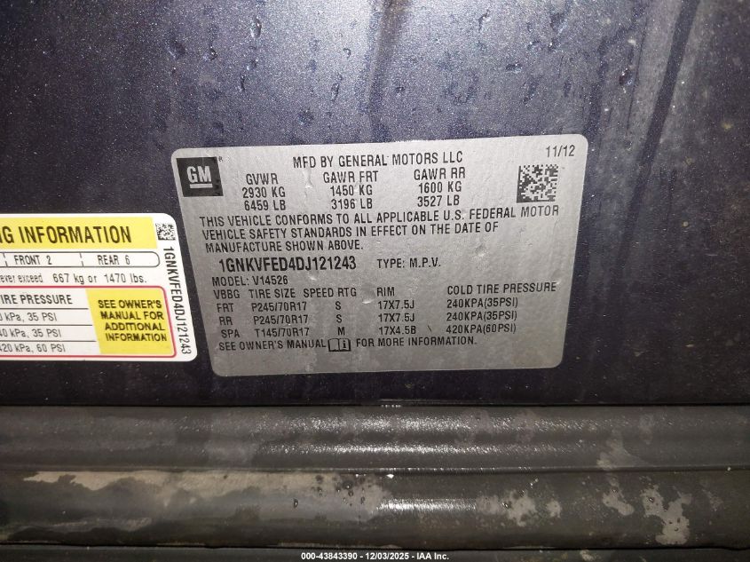 2013 CHEVROLET TRAVERSE 2013 року Бензин, 3.6, Полный привод, vin - 1GNKVFED4DJ121243 из США