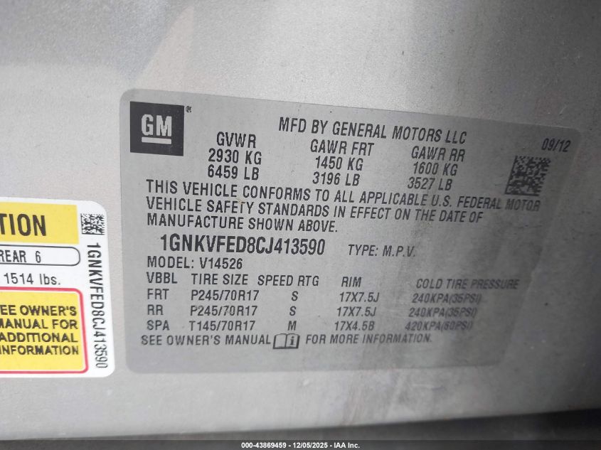 2012 CHEVROLET TRAVERSE 2012 року Бензин, 3.6, Полный привод, vin - 1GNKVFED8CJ413590 из США