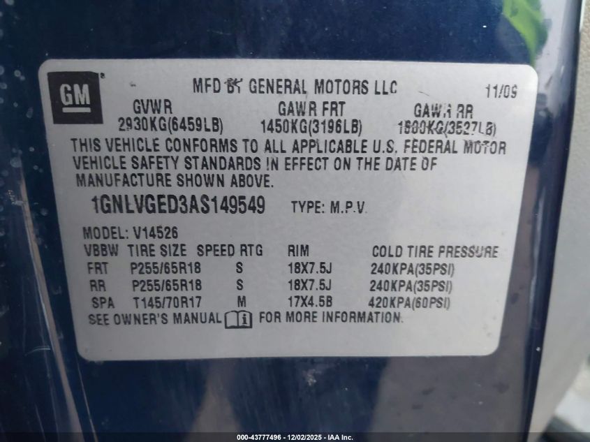 2010 CHEVROLET TRAVERSE 2010 року Бензин, 3.6, Полный привод, vin - 1GNLVGED3AS149549 из США