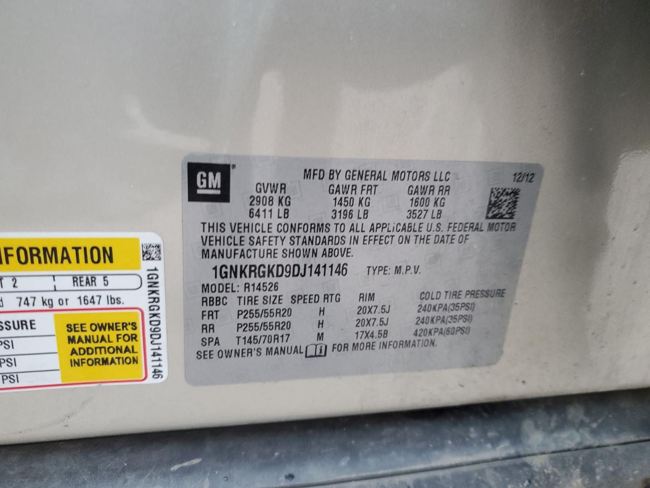 Цвет ЗолотойЦилиндры 6VIN 1GNKRGKD9DJ141146Состояние НеизвестноПовреждения Передняя или задняя