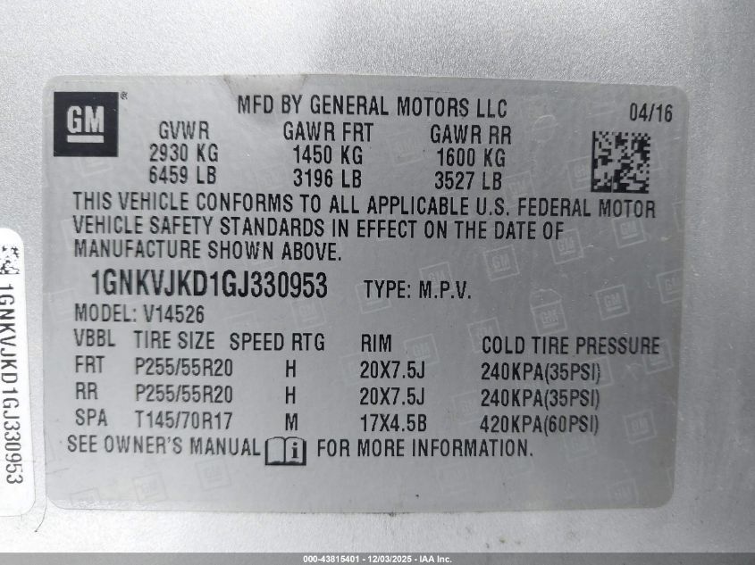 2016 CHEVROLET TRAVERSE 2016 року Бензин, 3.6, Полный привод, vin - 1GNKVJKD1GJ330953 из США