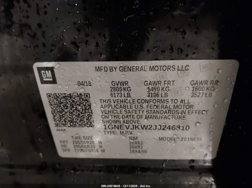 2018 CHEVROLET TRAVERSE 2018 року Бензин, 3.6, Полный привод, vin - 1GNEVJKW2JJ246310 из США
