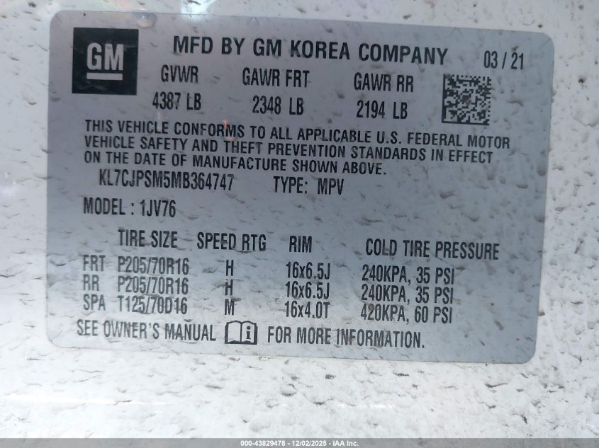 2021 CHEVROLET TRAX 2021 року Бензин, 1.4, Полный привод, vin - KL7CJPSM5MB364747 из США