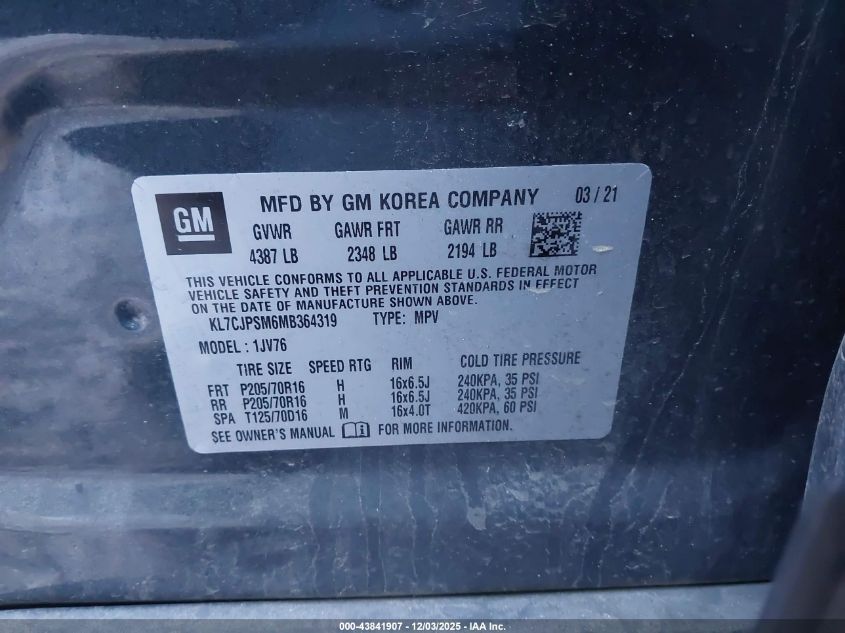 2021 CHEVROLET TRAX 2021 року Бензин, 1.4, Полный привод, vin - KL7CJPSM6MB364319 из США