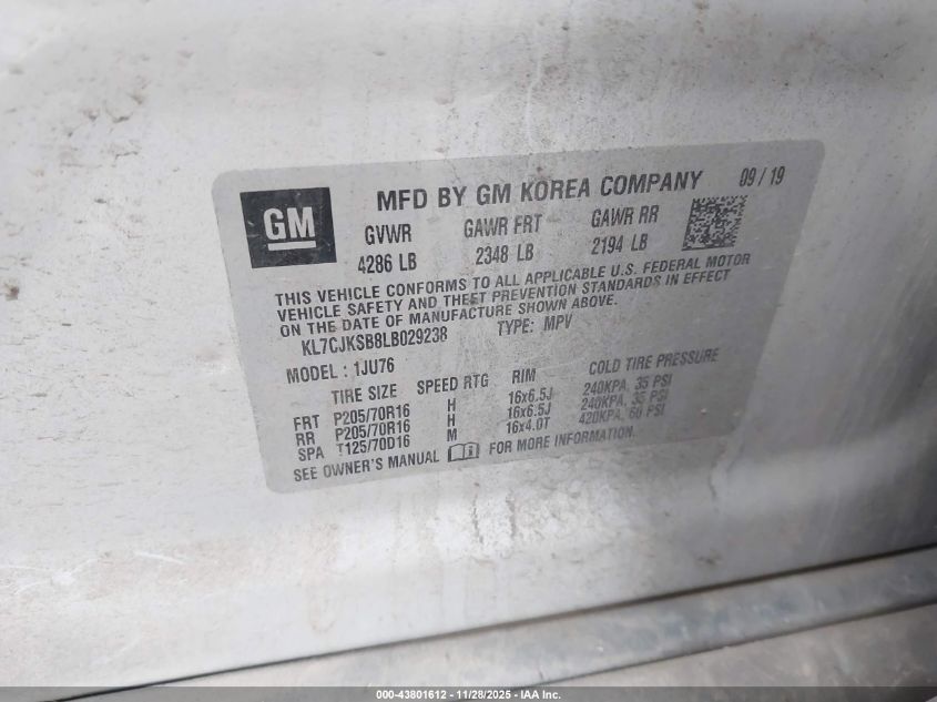 2020 CHEVROLET TRAX 2020 року Бензин, 1.4, Передний привод, vin - KL7CJKSB8LB029238 из США