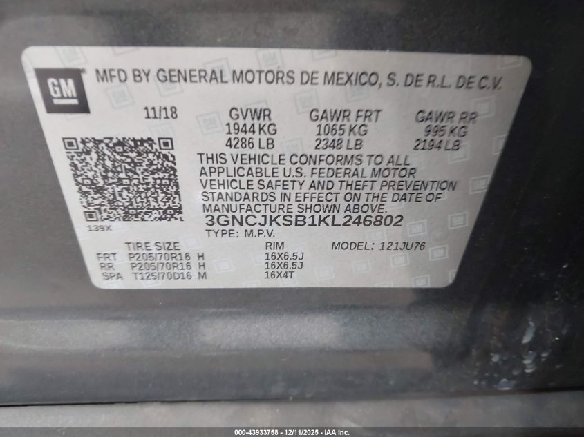 2019 CHEVROLET TRAX 2019 року Бензин, 1.4, Передний привод, vin - 3GNCJKSB1KL246802 из США