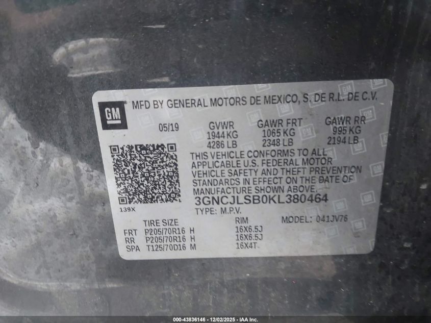 2019 CHEVROLET TRAX 2019 року Бензин, 1.4, Передний привод, vin - 3GNCJLSB0KL380464 из США