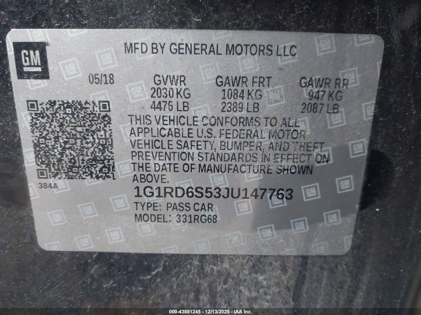 2018 CHEVROLET VOLT 2018 року Гибрид, 1.5, Передний привод, vin - 1G1RD6S53JU147763 из США