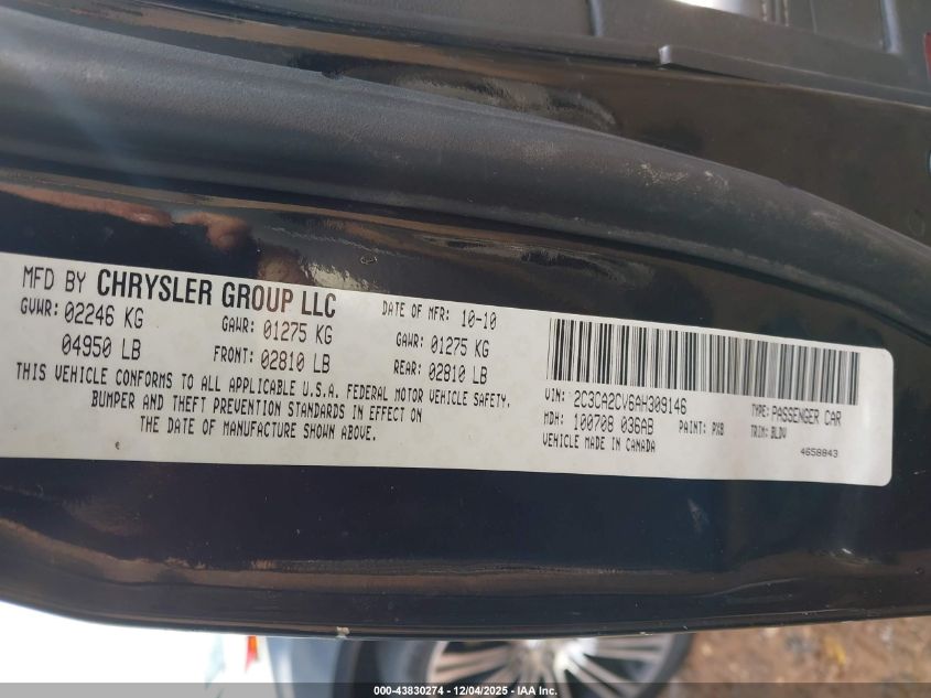 Цвет ЧерныйЦилиндры 6Привод Задний приводVIN 2C3CA2CV6AH309146Состояние Заводится и едет (проверено)Повреждения Передняя или задняя
