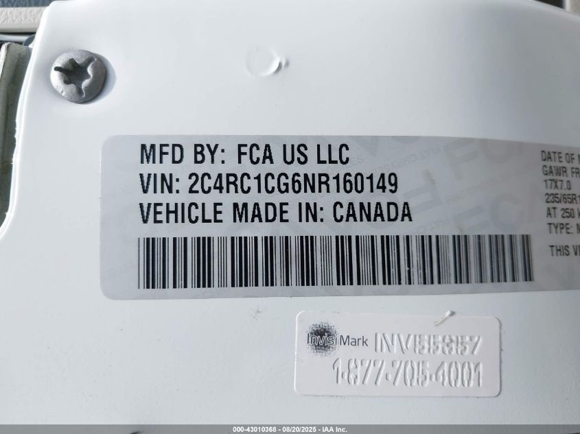Цвет БелыйЦилиндры 6Привод Передний приводVIN 2C4RC1CG6NR160149Состояние СтационарноПовреждения Передняя или задняя