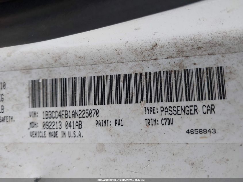 Цвет БелыйЦилиндры 4Привод Передний приводVIN 1B3CC4FB1AN225070Состояние СтационарноПовреждения Био/Химические AutoRIA