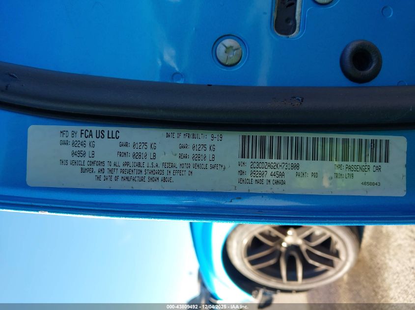 2019 DODGE CHALLENGER 2019 року Бензин, 3.6, Задний привод, vin - 2C3CDZAG2KH731808 из США